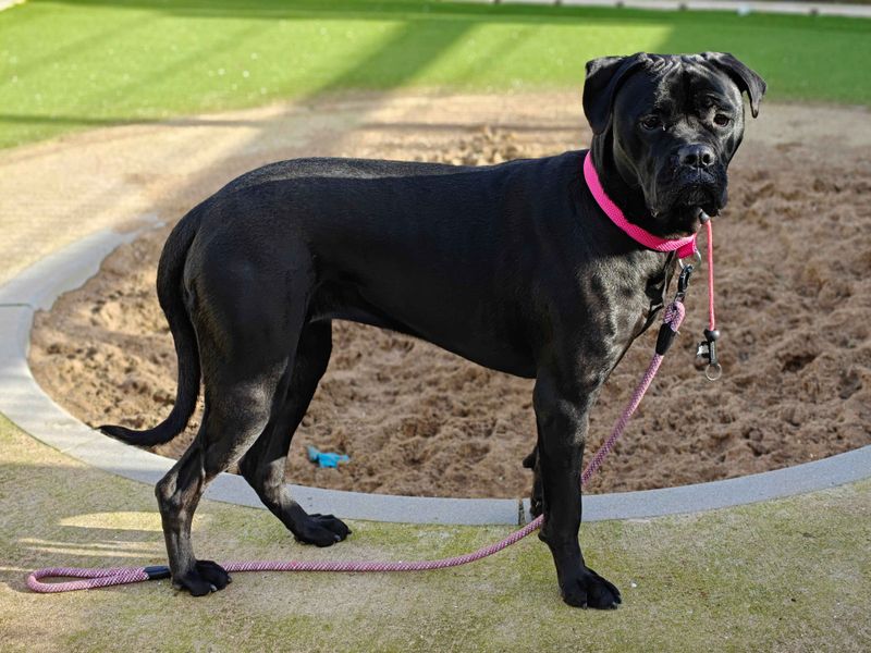 Ginny's ideal home Ginny is a sweet Cane Corso who is an absolute darling. She is able to live with another medium or large Dogs. She is polite and friendly but does enjoy playing so would need a playmate that can handle her boisterous play style. She would benefit from social dog friends and can live with children 8+ that are sensible. She is also able to be left alone for up